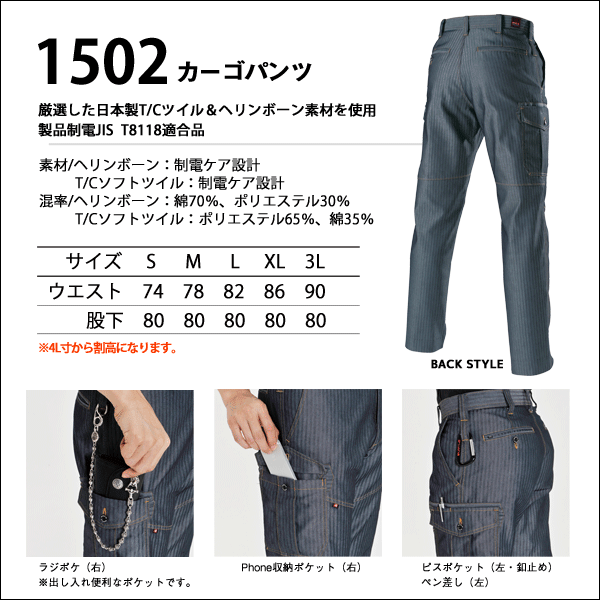 BURTLE バートル 秋冬 カーゴパンツ 1502 作業着 ヘリンボーン【メーカー在庫確認・お取り寄せ品】
